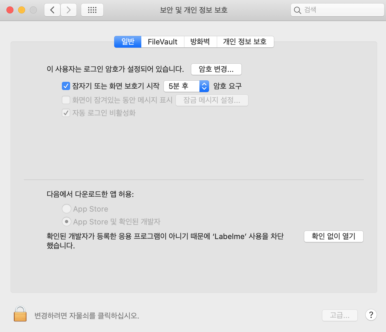 "Labelme 확인 없이 열기"를 설정하기 위해 왼쪽 아래의 자물쇠를 클릭합니다.
