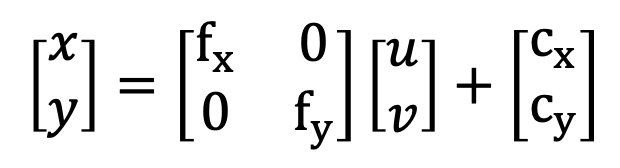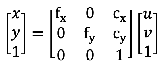 그림 "정규좌표계"에서, Image plane(픽셀 좌표계)에서 정규좌표계로 변환은 비례식을 이용하면 됩니다. 비례관계를 알기 위해서는 Focal length와 Principal point가 필요합니다. 즉, 픽셀 좌표계에서 정규 좌표계로 변환하기 위해서는 Intrinsic parameter가 필요합니다. 카메라의 Intrinsic parameter는 카메라마다 다르기 때문에 카메라마다 계산을 해주어야 하는데, Camera Calibration을 통해 얻을 수 있습니다. 픽셀 좌표계와 정규 좌표계의 변환 관계는 아래와 같습니다.