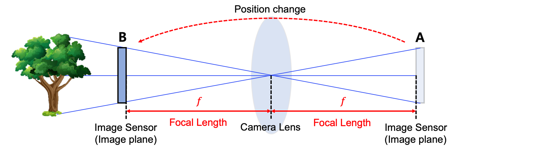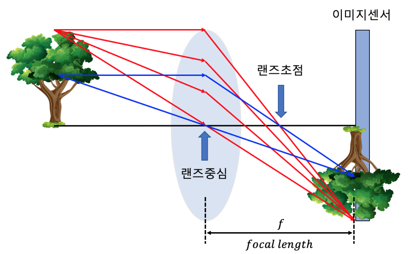 매칭관계: 핀홀-렌즈중심, 이미지가 맺히는 상자 내벽-이미지센서