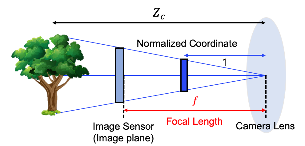 카메라의 세팅, 제조 과정의 차이로 인해 Focal length와 Principal point는 카메라마다 달라집니다. 그래서 우리는 동일한 피사체를 촬영하더라도 카메라에 따라 다른 이미지를 얻게 됩니다. 기하학적 해석을 할 때, 각각 다른 카메라의 특성에 따라 기하학적 해석을 하는 것은 굉장히 귀찮은 일입니다. 이러한 귀찮은 일을 하지 않기 위해, 어떤 카메라로 촬영하든 카메라 좌표계와 거리가 1이고, 중심의 좌표가 주점인 새로운 이미지 평면으로 좌표계(정규 좌표계)로 변환합니다. 즉, 우리는 정규 좌표계로 계산한 기하학적 해석만 있으면, 모든 카메라에 대한 기하학적 해석이 가능해집니다.