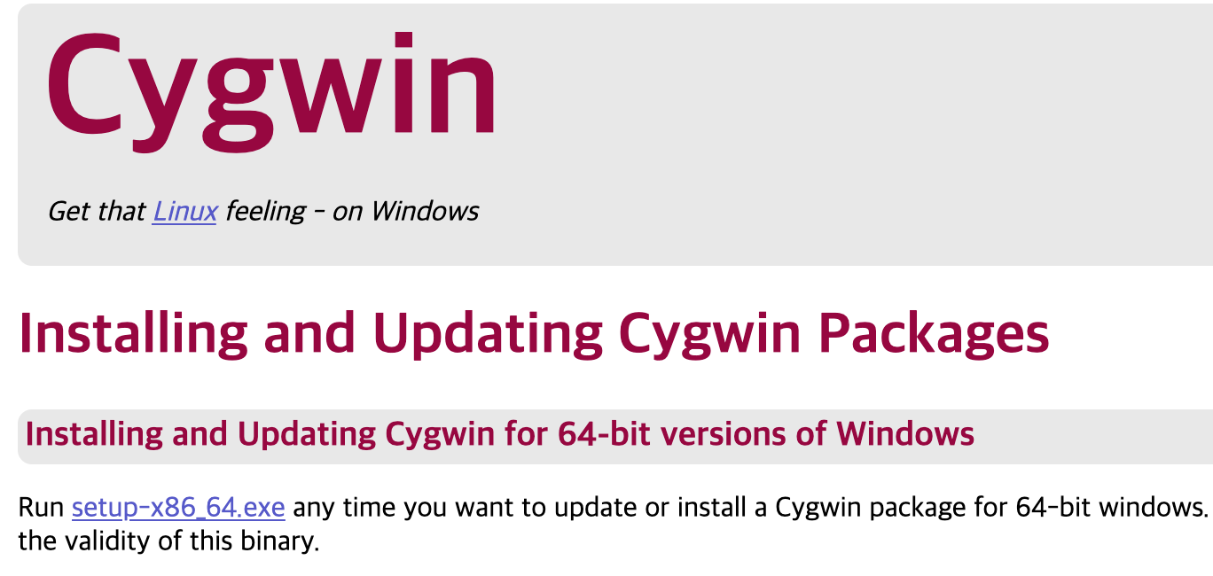 1. www.cygwin.com/install.html에 웹 브라우저를 열고 "setup-x86_64.exe"를 다운로드하세요.
