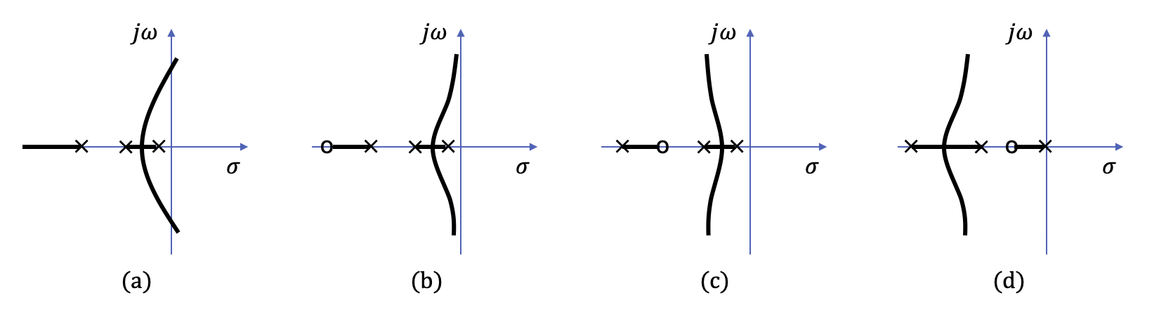 (a) 작은 이득에는 안정하나 큰 이득에 대하여 불안정한 시스템, (b), (c), (d) 개루프 전달함수에 영점을 추가하였을 때, 그 영향을 보여주는 시스템의 근궤적선도