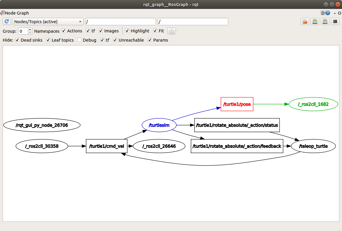 /turtlesim 노드가 pose 토픽에도 발행하고 있으며, 새로운 echo 노드가 이에 구독하고 있는 것을 확인할 수 있습니다.