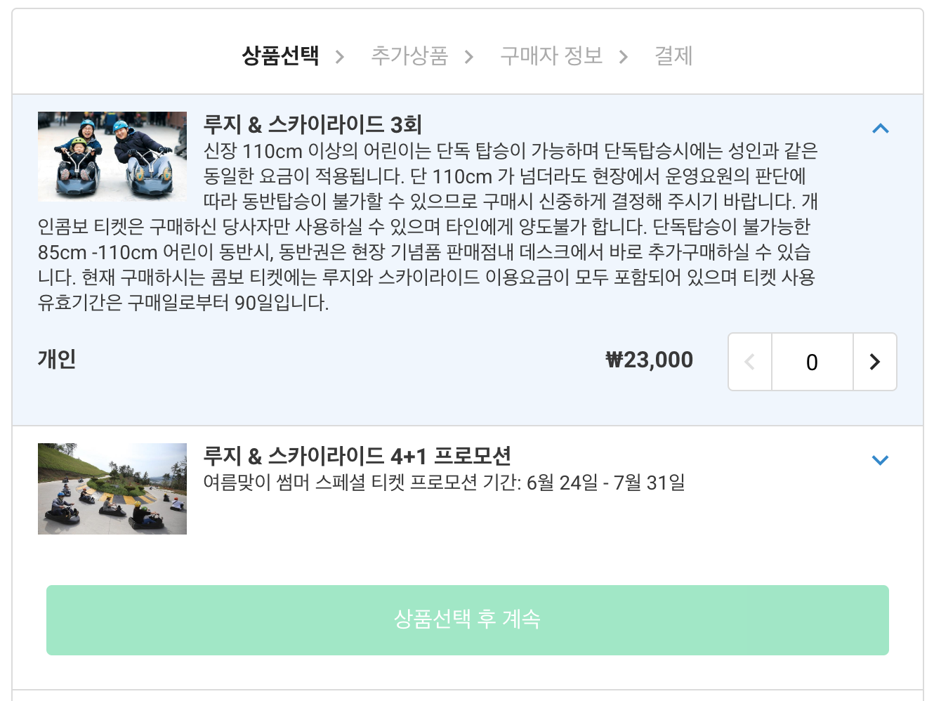 티켓은 모바일(휴대폰)과 PC로 구매 가능합니다. 1회만 타는 것은 너무 아쉬울 것 같아서 "루지 & 스카이라이드 3회" 를 구매했는데, 아쉽지도 지루하지도 않게 딱 즐기고 온 것 같습니다.