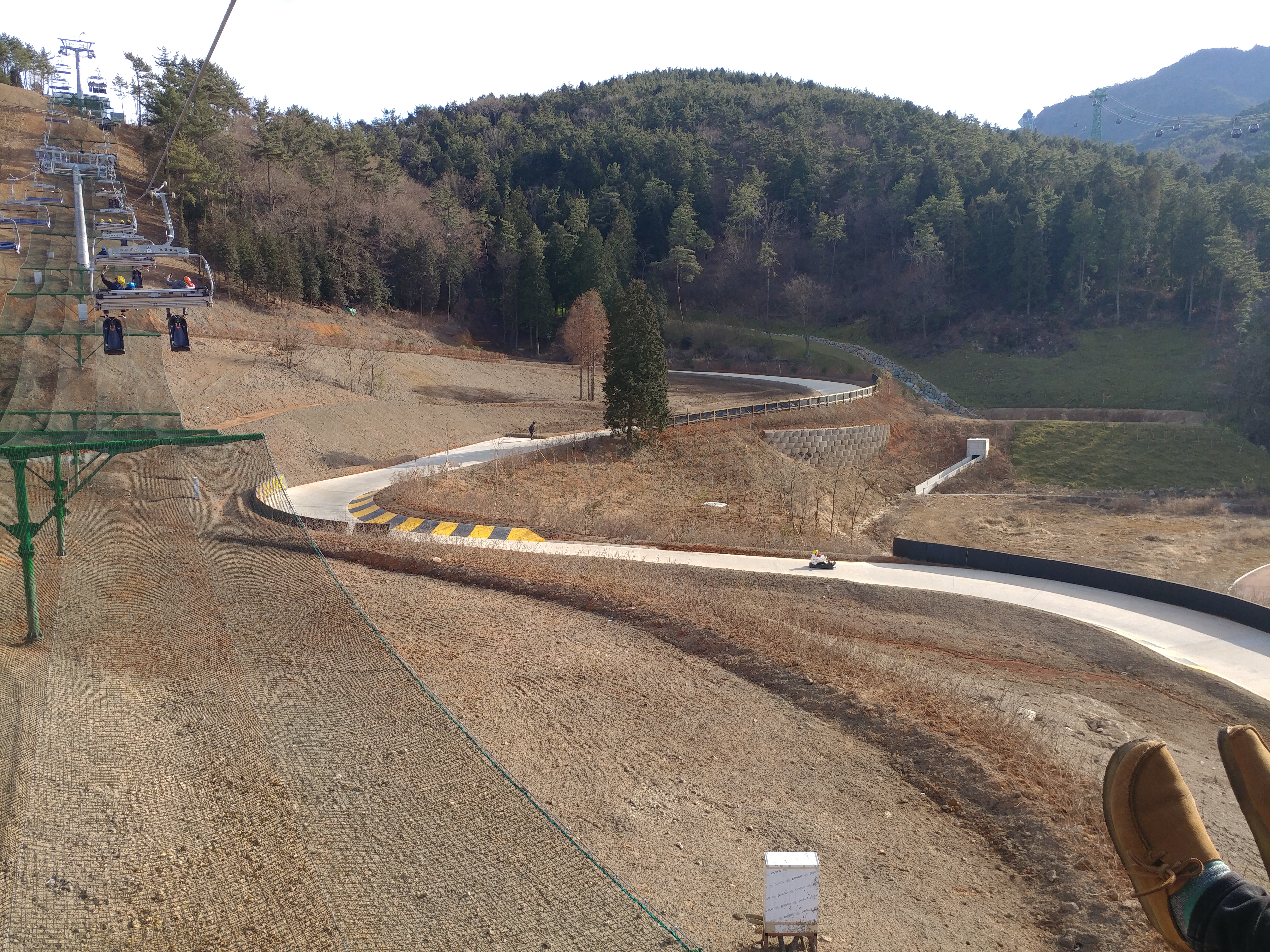 올라갈때는 스키의 '리프트'를 타는 것처럼 '스카이라이드'를 타고 위로 올라갑니다. 위로 올라가면서 아래를 내려다보면 사람들이 루지를 타면서 내려오고 있습니다. 어떤 구간에 가면 사람들이 소리를 지르기도 하는데, 알고보니 '점프' 코스가 있었습니다. 속도를 줄이기 않고 내려오면 그 구간에서 루지가 점프를 하더군요. 저는 고소공포증이 있어서 안전운전을 ㅜㅜ