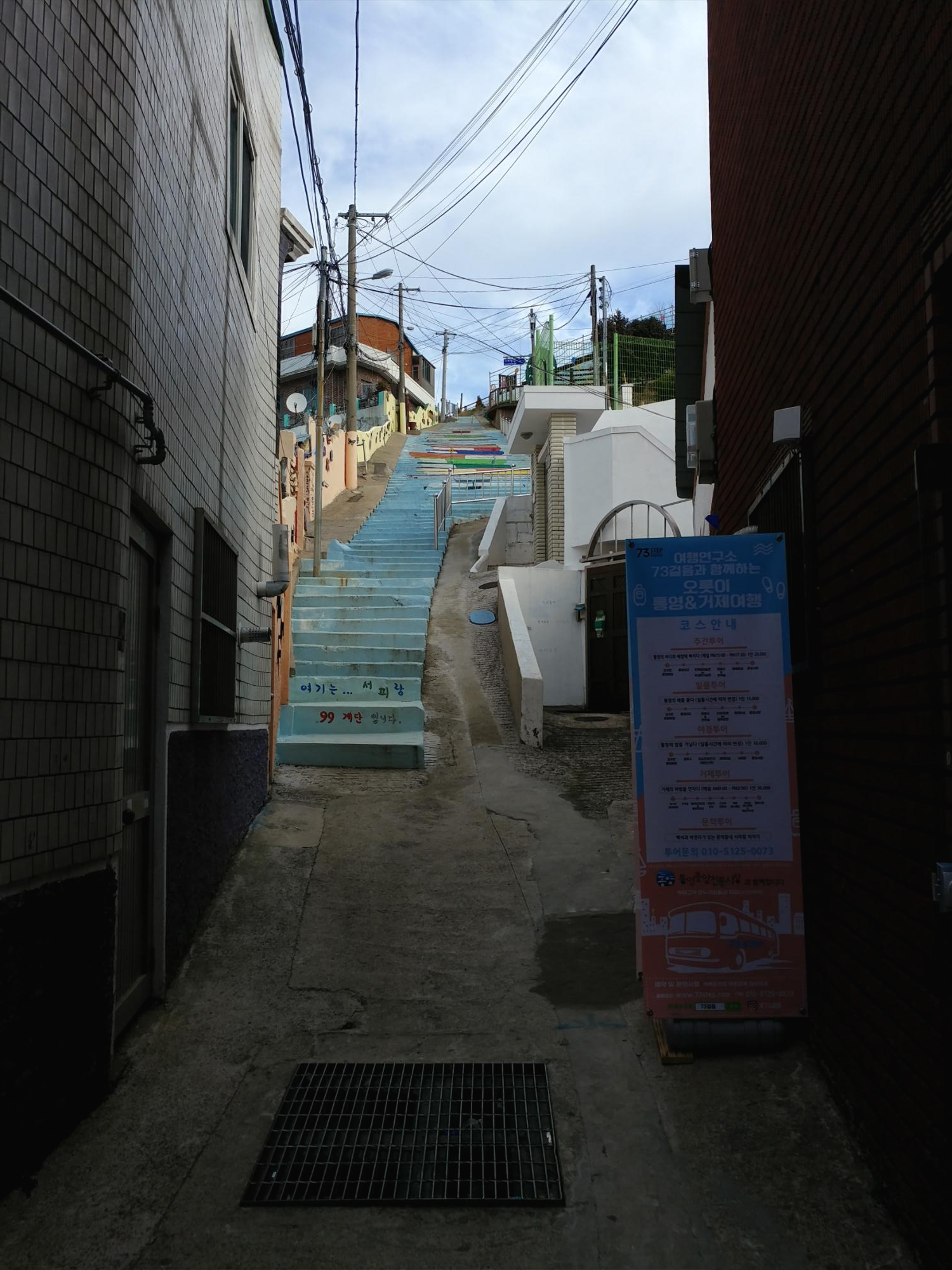 서피랑의 '99계단' 입니다. 계단 옆에 집들이 있는 것을 보니 실제로 주민들이 오르고 내리는 길인 것 같습니다. 특이한 것은 계단에 색이 칠해져 있을 뿐만 아니라 무언가가 계단마다 적혀 있다는 것입니다.