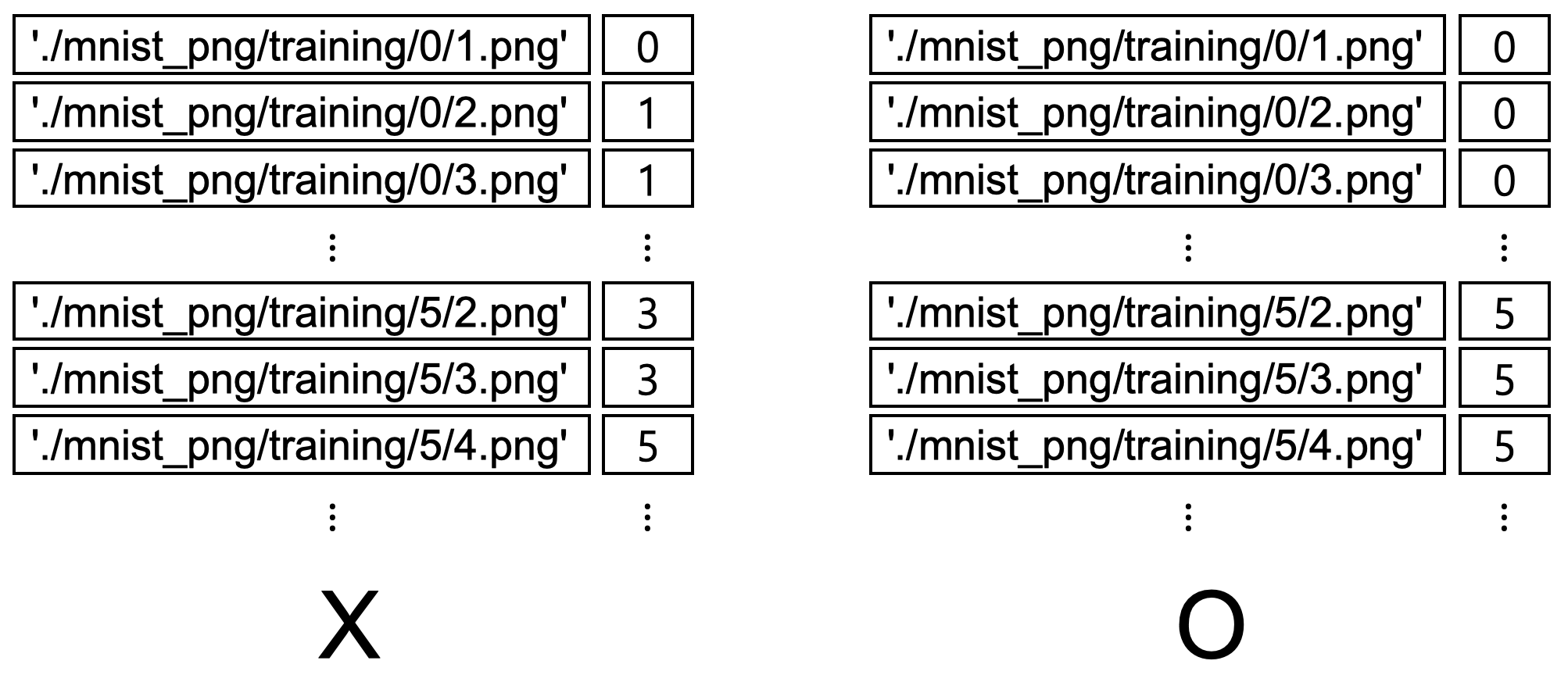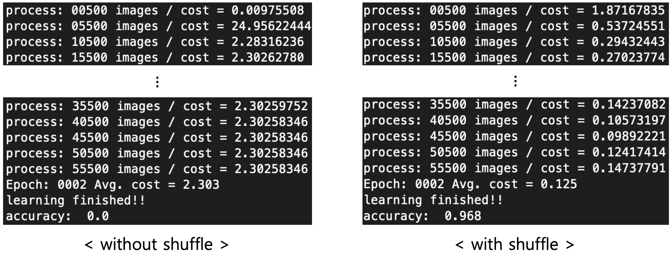 위의 그림에서 첫 번째 그림은 셔플을 하지 않은 경우, 아래의 그림은 셔플을 한 경우이다. 셔플을 하지 않으면 label이 '0'인 경우를 모두 학습한 후 label이 '1'인 경우를 학습하고, 순서대로 label이 '9'인 경우까지 학습한다. 셔플을 하면 label의 순서가 뒤섞이게 되어 여러가지 종류의 label이 골고루 학습된다.