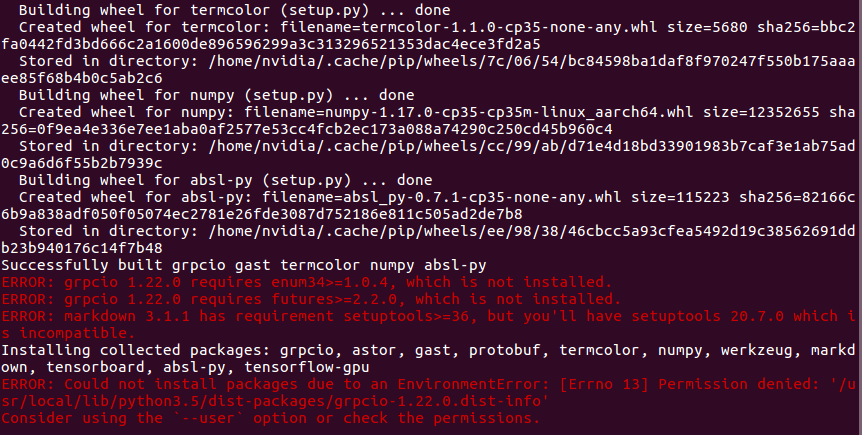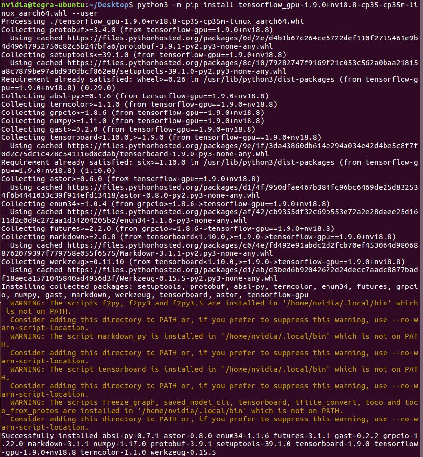 예를 들면, python3 -m pip install tensorflow_gpu-1.90.+nv18.8-cp35-cp35m-linux_aarch64.whl --user