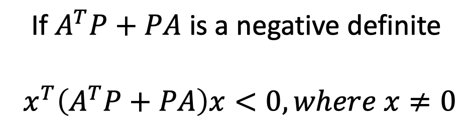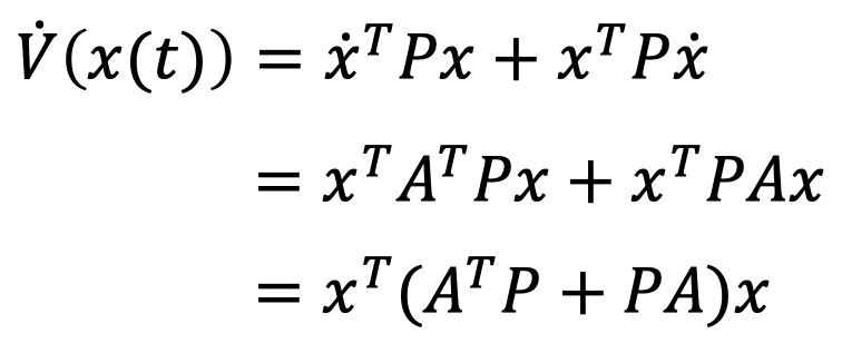 A는 시스템의 모델이기 때문에 이미 주어져 있습니다. 따라서 Lyapunov equation -Q가 negative definite가 되도록 적절한 P (positive definite)를 설정하면 시간이 지날수록 V(x)의 값이 줄어들도록 할 수 있습니다(항상 0으로 수렴하는 것은 아니지만, 0으로 수렴할 가능성도 가지고 있습니다).