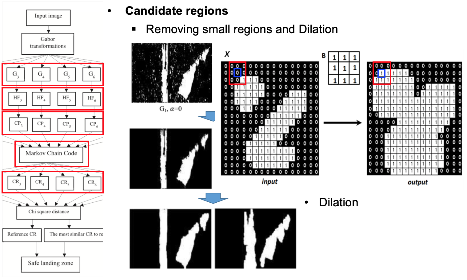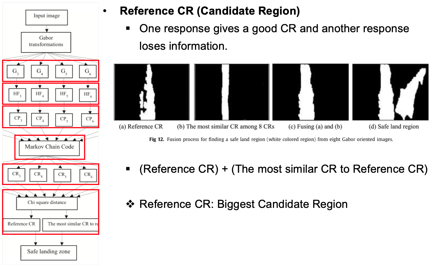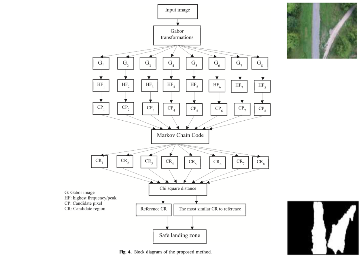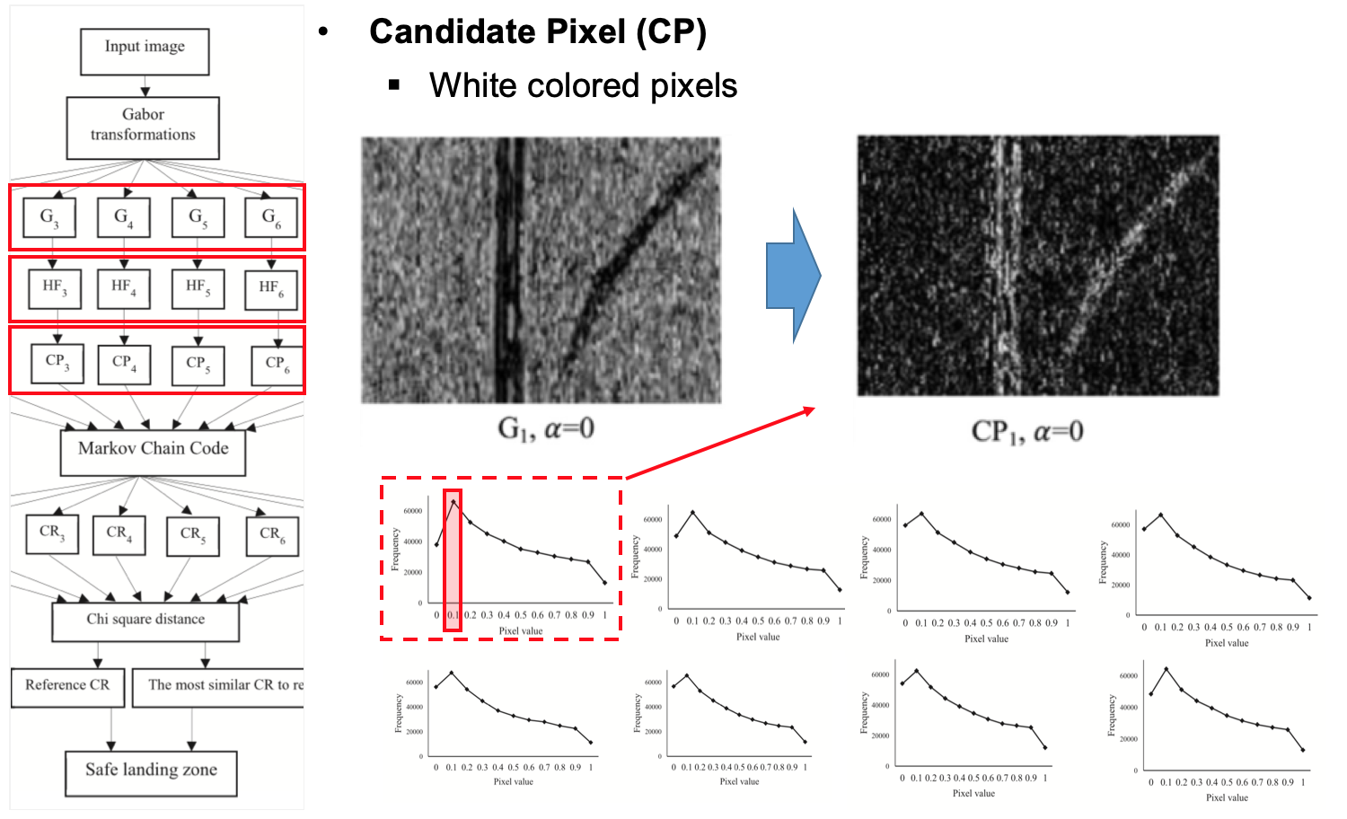 Image 정보를 기반으로 Landing site를 본 논문에서는 아래와 같은 Procedure를 제안하고 있습니다. Input image를 8개의 angle을 가진 Gabor filter를 통과시켜 Histogram을 얻습니다. Histogram은 Gabor filter를 통과한 Gabor image에 대해서 같은 intensity를 가진 pixel의 수를 나타낸 것입니다. Histogram을 기반으로 가장 많은 수를 가지고 있는 Pixel intencity를 Candidate Pixel(CP)로 정의하고, Markov Chain Code를 사용하여 Candidate Rigion(CR)을 추려냅니다. 가장 큰 CR을 Reference CR로 정의하고 그래프의 유사도를 측정하는 방법 중의 하나인 Chi square distance를 기반으로 Reference CR과 가장 유사한 CR와의 범위를 합쳐서 최종적으로 Safe landing zone을 결정하게 됩니다.