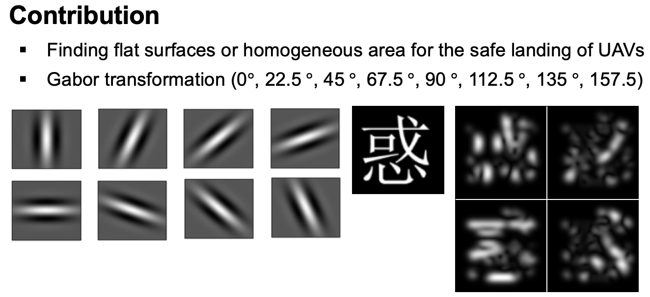 본 논문에서 제안한 방법은 Gabor filter를 사용하는 것입니다. Gabor filter는 아래의 그림과 같이 angle에 따라 region의 texture를 추출할 수 있습니다. 어느 한 지역에 대해 8가지의 각도 값을 가진 Gabor filter를 통과시킵니다. 아래에 보이는 한자를 구성하고 있는 특정 선분들은 Gabor filter의 angle에 따라 각각 추출됩니다. 만약 8개의 filter를 통과시켰는데 아무것도 검출되지 않았다면, 그 지역은 선분이 없는 지역으로 간주할 수 있습니다. 즉, 검은색 배경처럼 선분이 검출되지 않은 부분은 flat 한 region으로 간주되어 landing region으로 선택될 수 있습니다.