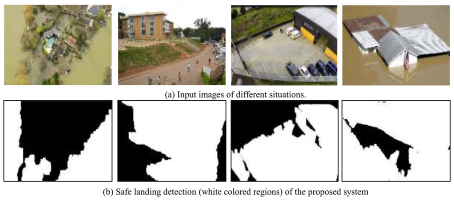 다음 그림은 실험 결과를 나타냅니다. White는 safe landing zone을 의미합니다. Input image와 결과를 비교했을 때, 제안한 방법이 safe landing zone을 가장 잘 찾아내는 것을 확인할 수 있습니다. 가장 오른쪽의 이미지에 대해서 자동차 때문에 도로임에도 불구하고 safe landing zone으로 detection하지 않았습니다.