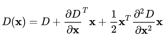 위에서 구한 극값들의 위치는 대략적인 것입니다. 실제 극값의 위치는 pixel들의 사이 공간에 있을 확률이 높습니다. 하지만 우리는 진짜 극값의 위치에 접근할 수 없기 때문에 수학적으로 계산합니다. 아래의 수식은 DoG 이미지에 대한 테일러급수를 나타냅니다. D는 DoG 이미지를 나타내고, X는 (x, y, standard deviation)을 나타냅니다. 아래의 식을 X에 대해 미분해서 0이 되는 지점이 극값이 될 것입니다 [5]. 이러한 방법은 알고리즘이 좀 더 안정적인 성능을 낼 수 있게 도와준다고 합니다.