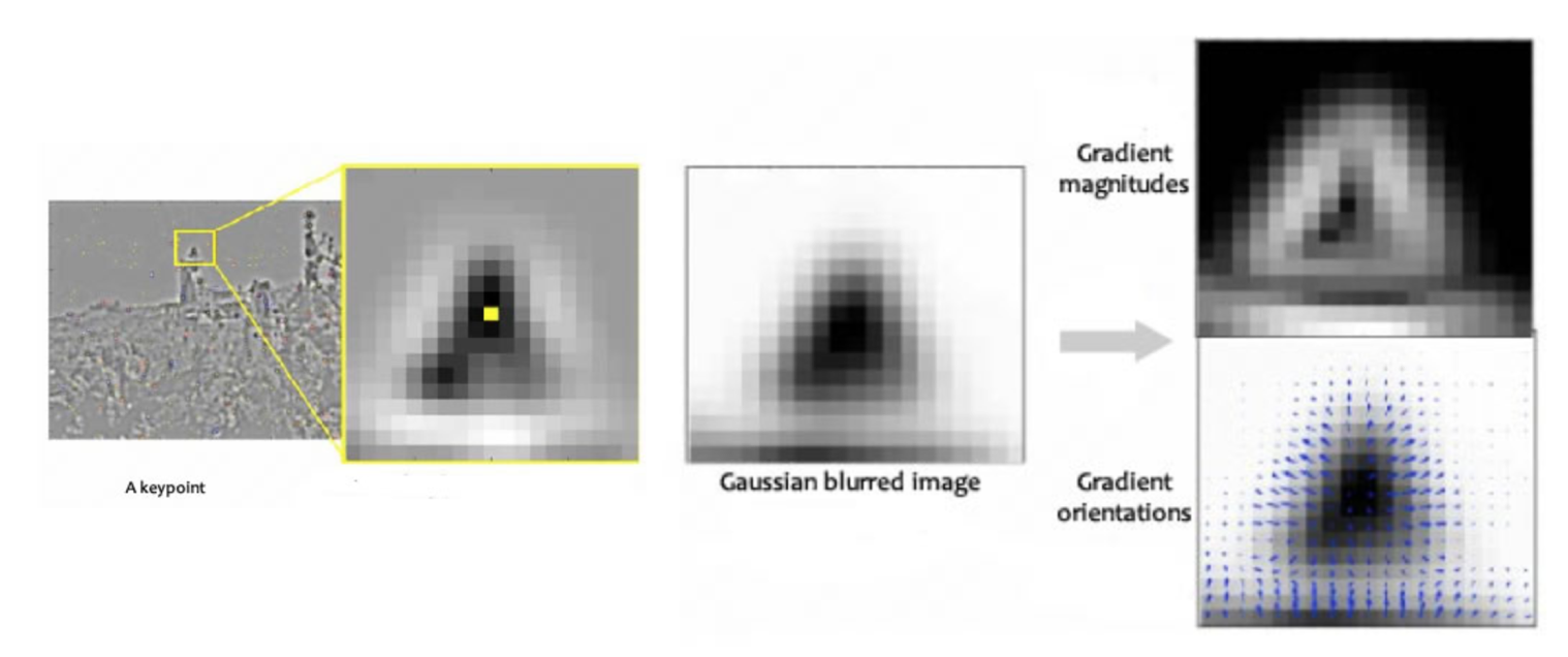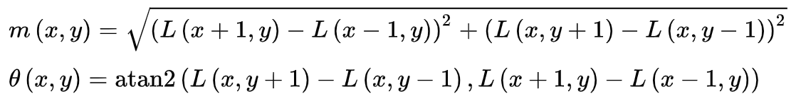 Keypoint 마다 방향을 할당해주는 역할을 해주는 단계입니다. Keypoint 주변으로 아래의 두 식을 이용해서 keypoint 주변 gradient의 크기 및 방향을 알아낼 수 있습니다.