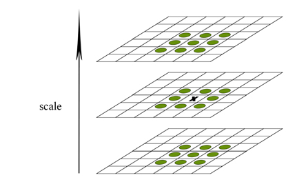 이제 극값(극대 값 또는 극소값)을 얻기 위해 각각의 octave에서 scale이 다른 3개의 이미지를 아래의 그림처럼 겹쳐놓습니다(예를 들어, 1-2-3 또는 2-3-4 --> 1, 4 DoG 이미지에서는 keypoint를 찾을 수 없음). 1개의 x는 검사하는 point, 녹색 circle은 26개의 neibor pixel들입니다. x의 값이 26개의 neibor pixel들과 비교해서 가장 크거나 가장 작으면 keypoint로 간주하고, 그렇지 않으면 keypoint로 정하지 않습니다. 이러한 연산은 각 octave 마다 2번씩 발생하고, octave의 수는 4개이기 때문에 결국 8장의 극값 이미지를 얻게 됩니다 [4].