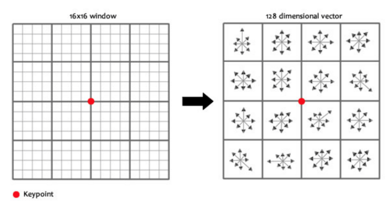 지금까지 keypoint들을 결정하기 위해 여러 가지 절차를 진행했습니다. 이제 이 keypoint들을 식별하기 위한 fingerprint(지문)과 같은 특별한 정보를 부여해주어야 합니다. 아래의 그림처럼 keypoint를 중심으로 16x16 크기의 윈도우를 세팅하고, 이 윈도우를 4x4의 크기를 가진 16개의 작은 윈도우로 구성합니다.