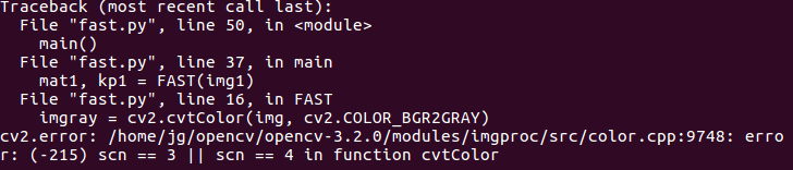 위의 에러는 cv2.cvtColor에 입력될 이미지의 채널이 맞지 않아서 발생합니다. BGR2GRAY는 BGR의 3 채널 color 이미지를 1 채널의 gray 이미지로 바꾸는 API입니다. 이 API에 입력해야 할 이미지는 3 채널 이미지인데 입력으로 1 채널 이미지를 넣으면 위와 같은 에러가 발생합니다. 위의 이미지가 발생하면 입력할 이미지의 shape을 print('img1.shape: ', img1.shape) 명령어를 통해 확인해보시고 3 채널 이미지로 넣어주시면 위와 같은 에러 없이 API가 잘 실행될 겁니다.