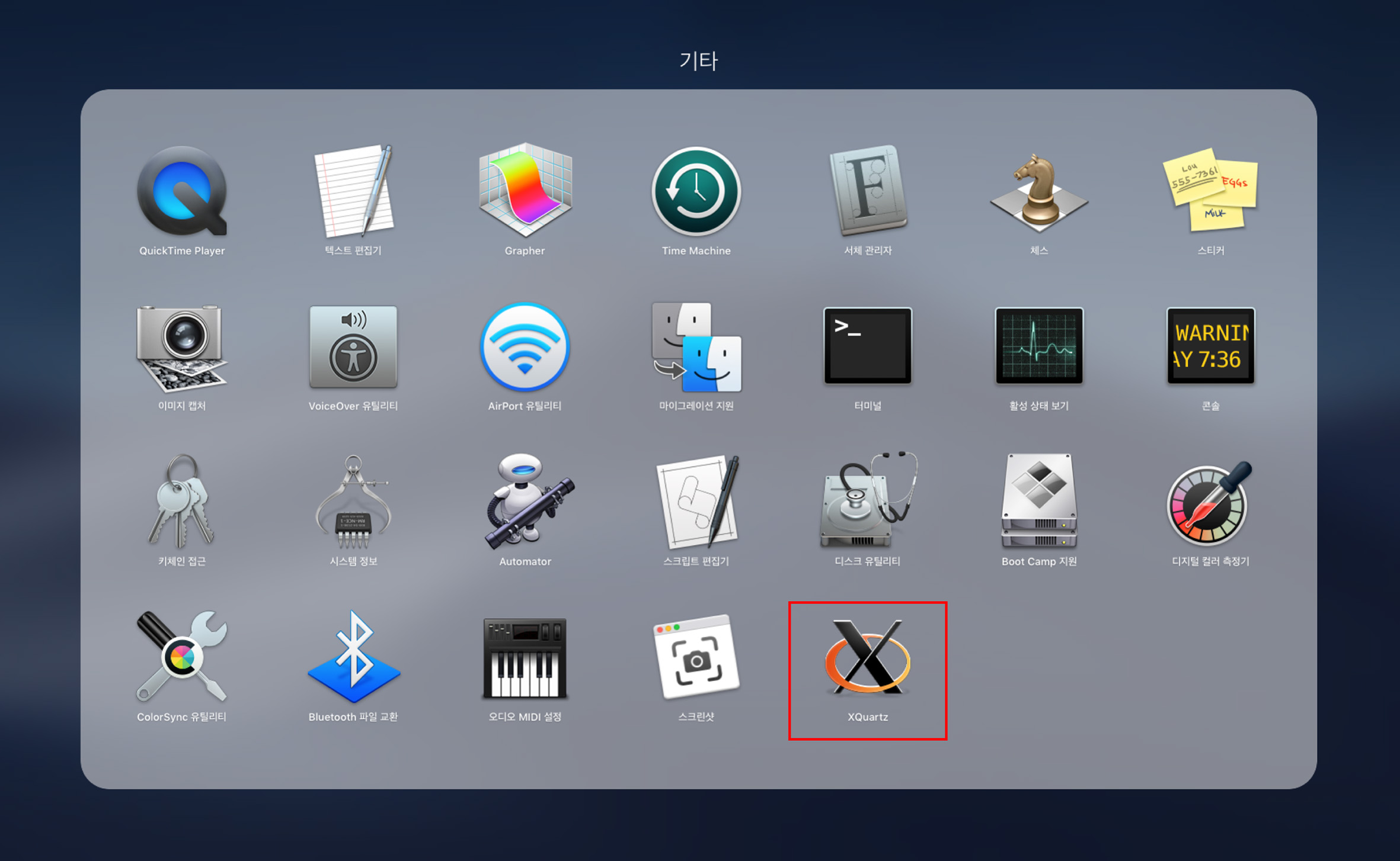 2. Applications > Utilities > XQuartz.app 를 실행한다.