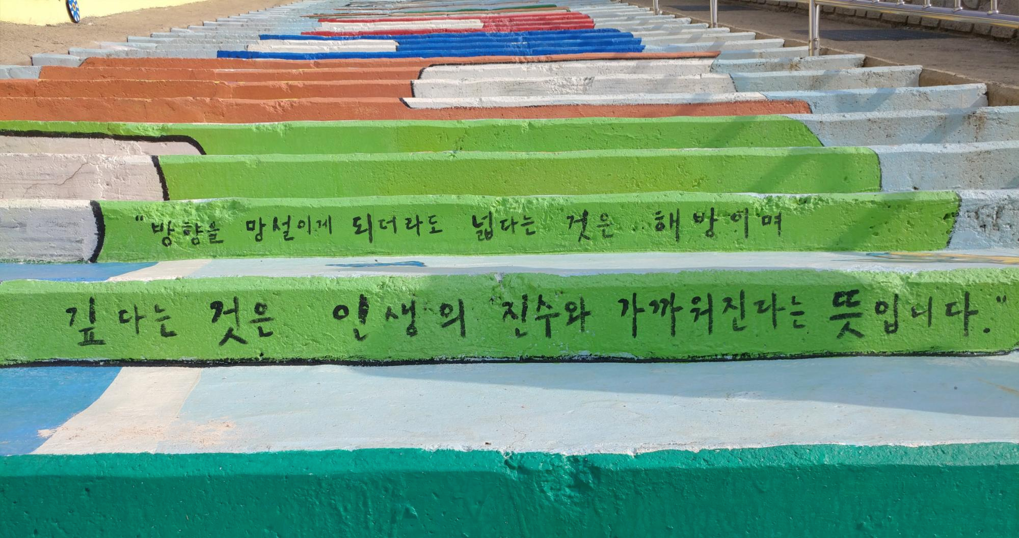 서피랑의 '99계단' 입니다. 계단 옆에 집들이 있는 것을 보니 실제로 주민들이 오르고 내리는 길인 것 같습니다. 특이한 것은 계단에 색이 칠해져 있을 뿐만 아니라 무언가가 계단마다 적혀 있다는 것입니다.