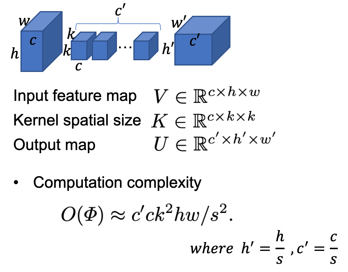 본 논문에서는 accuracy를 희생시키지 않으면서 inference 속도를 높이는 것이 목표이기 때문에, 속도를 증가시키는 요인이 무엇인지 알아내는게 중요할 것 같습니다. V는 Input feature map, K는 Kernel spatial size, 그리고 U는 Output map을 의미합니다. 어떤 이미지가 주어졌을 때, Convolution연산을 수행하는데 필요한 계산은 다음과 같습니다. 즉, 크기가 w,h,c인 input image를 크기가 k,k,c인 필터 c’개로 Convolution 하는 연산의 수는 아래의 보이는 식이 됩니다. 그럼 연산량을 줄이기 위해서는 커널의 크기를 줄이든가 / 아니면 input image의 크기를 줄여야 합니다. 그런데 커널의 크기가 3 by 3 이라면 더 이상 줄일수가 없기 때문에 input image의 크기를 줄여야 합니다.