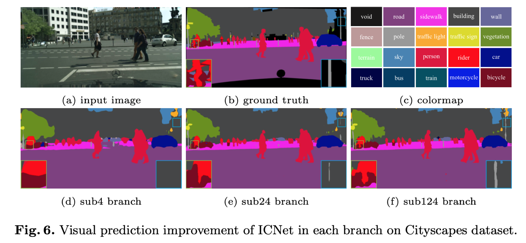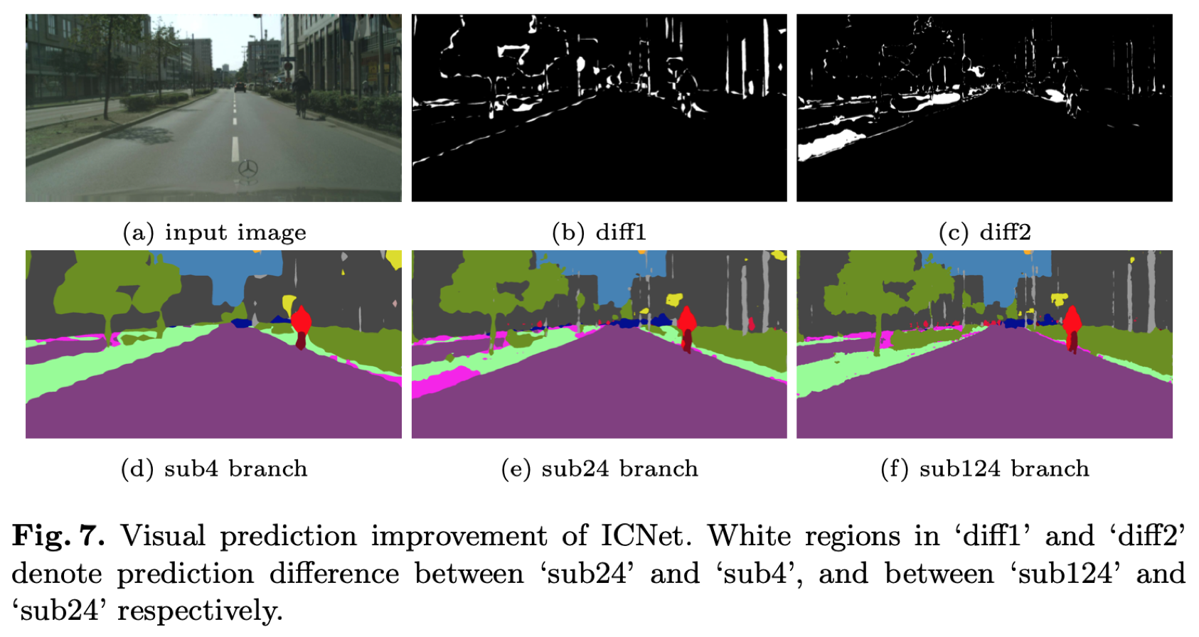 이전까지는 숫자로 performance improvement 를 나타냈었는데, 다음은 performance improvement를 visually 나타낸 것입니다. 흥미롭게도, 비록 top branch만을 사용했을 때에도 대부분의 semantically meaningful objects는 capture하는 것을 볼 수 있습니다. 그러나 오른쪽 상단에서처럼 pole이나 traffic sign 등과 같은 small-size의 object을 놓치거나 blurry된 object의 boundary가 발견되는 것을 확인할 수 있습니다. Sub124 branch는 이러한 detail을 refine하는데 도움을 주는 것을 확인할 수 있습니다.