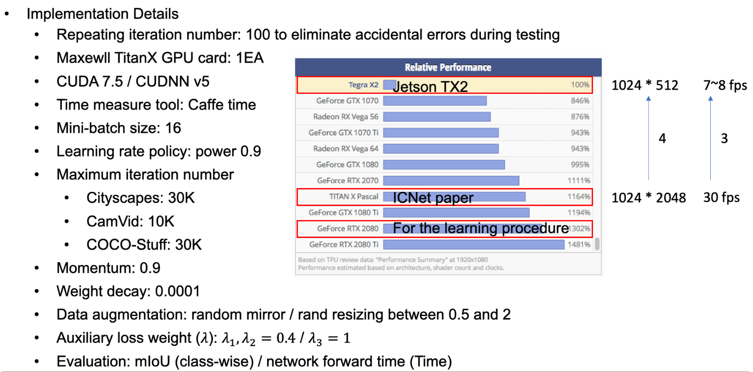 다음은 Implementation Detail를 나타냅니다. 자세한 내용은 한번 읽어보시면 될 것 같습니다. 저는 드론에서 Inference해야하기 때문에 임베디드 보드에서 작동할 수 있어야 합니다. ICNet논문에서는 TiTAN X GPU로 학습을 하고 저는 RTX2080으로 학습을 하였습니다. TiTAN X에서 inference 속도가 30FPS이기 때문에 성능이 1/12인 Jetson TX2에서는 이미지의 크기를 1/4로 줄이면 7~8FPS 속도로 inference 할 수 있다는 계산이 나오는데, 실제로 테스트 했을 때에도 7~8FPS정도 나오는 것을 확인했습니다.