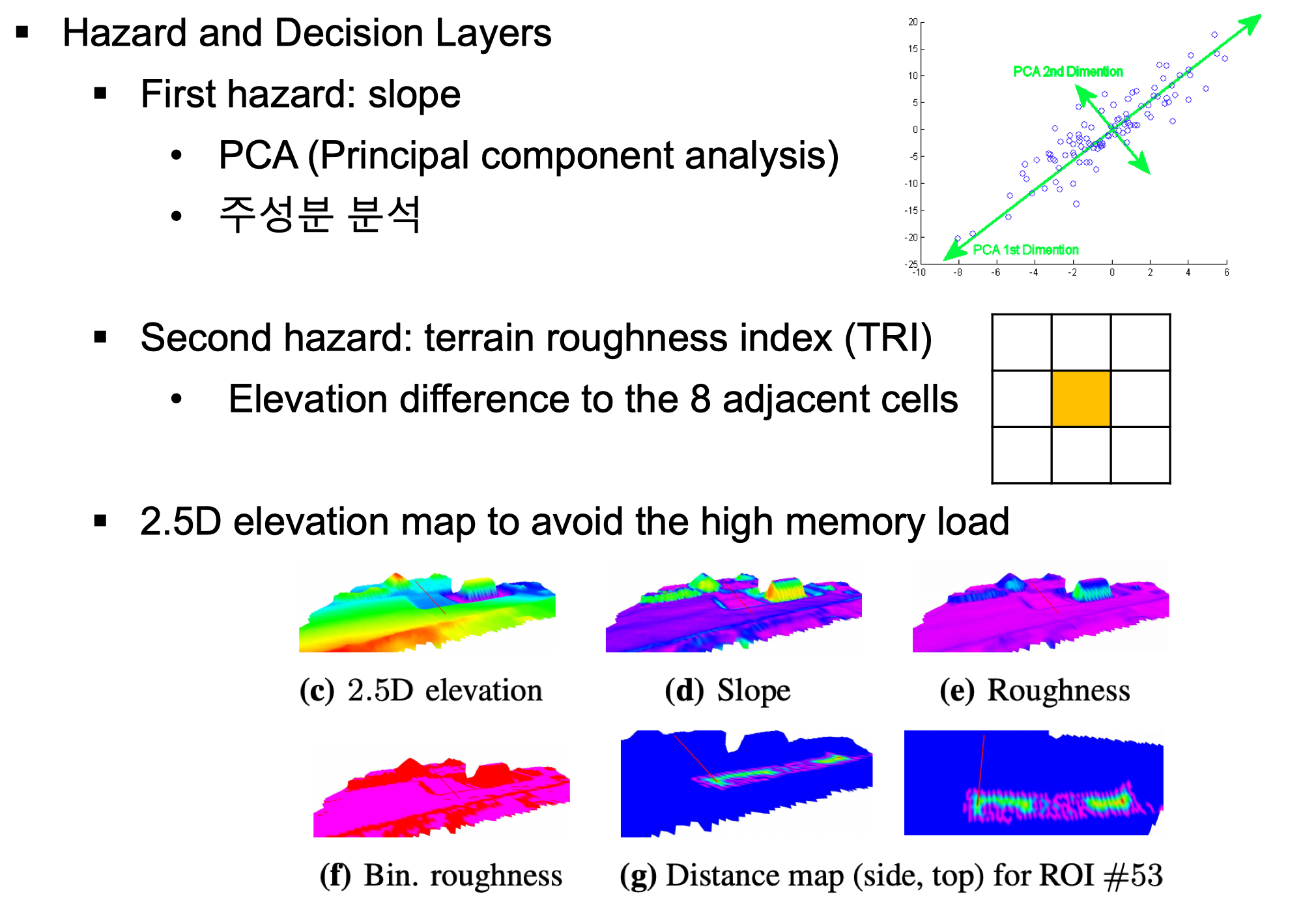 3D reconstruction을 통해 Grade가 가장 높은 지역의 3D point cloud information을 얻은 후 2.5D grid-based elevation map을 만들었습니다. 그리고 ROI에 위치하고 있는 점들의 분포를 PCA로 분석하여 Slop가 어떠한지 계산하였습니다. PCA는 Principal component analysis의 약자로 서로 연관성 있는 point들을 직교하는 주성분들로 표현하는 방법입니다. 오른쪽 아래와 같이 파란색으로 분포된 point들은 2개의 주성분으로 표현할 수 있습니다. 만약 ROI에서 파란색 point들 처럼 point가 분포되어 있다면 가장 큰 주성분을 기준으로 slop를 측정할 수 있습니다.