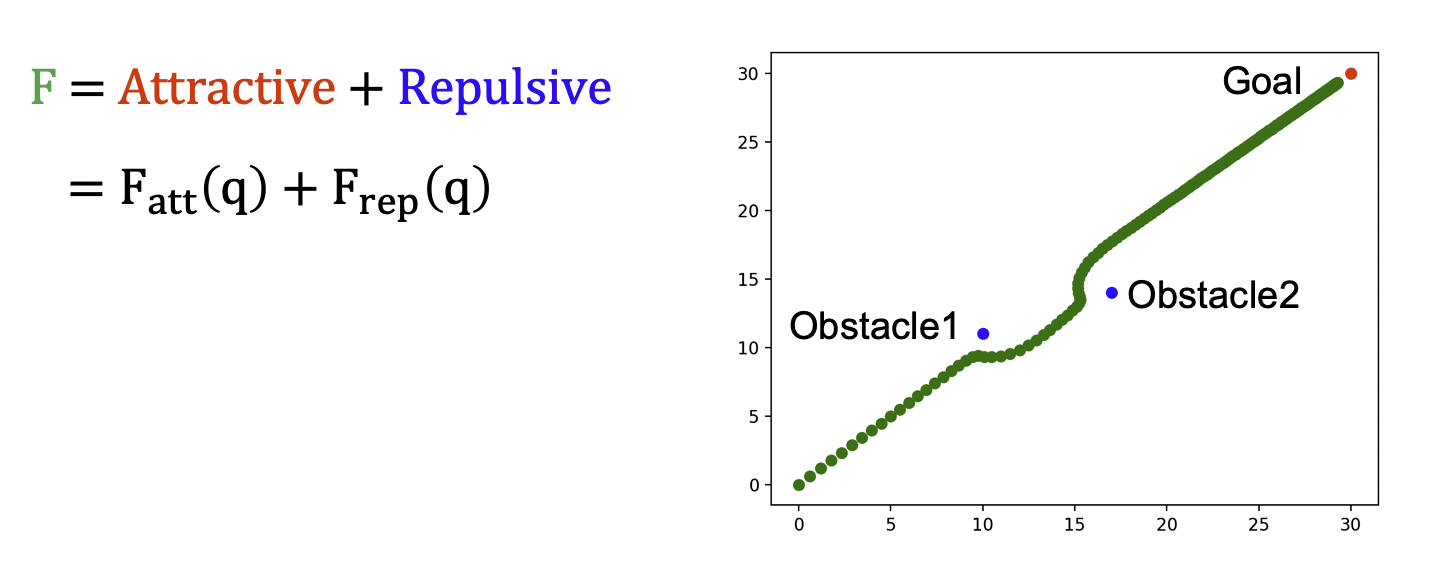 - 장애물의 Repulsive force의 합이 Attractive force 보다 크면, 좁은 공간을 지나갈 수 없습니다.