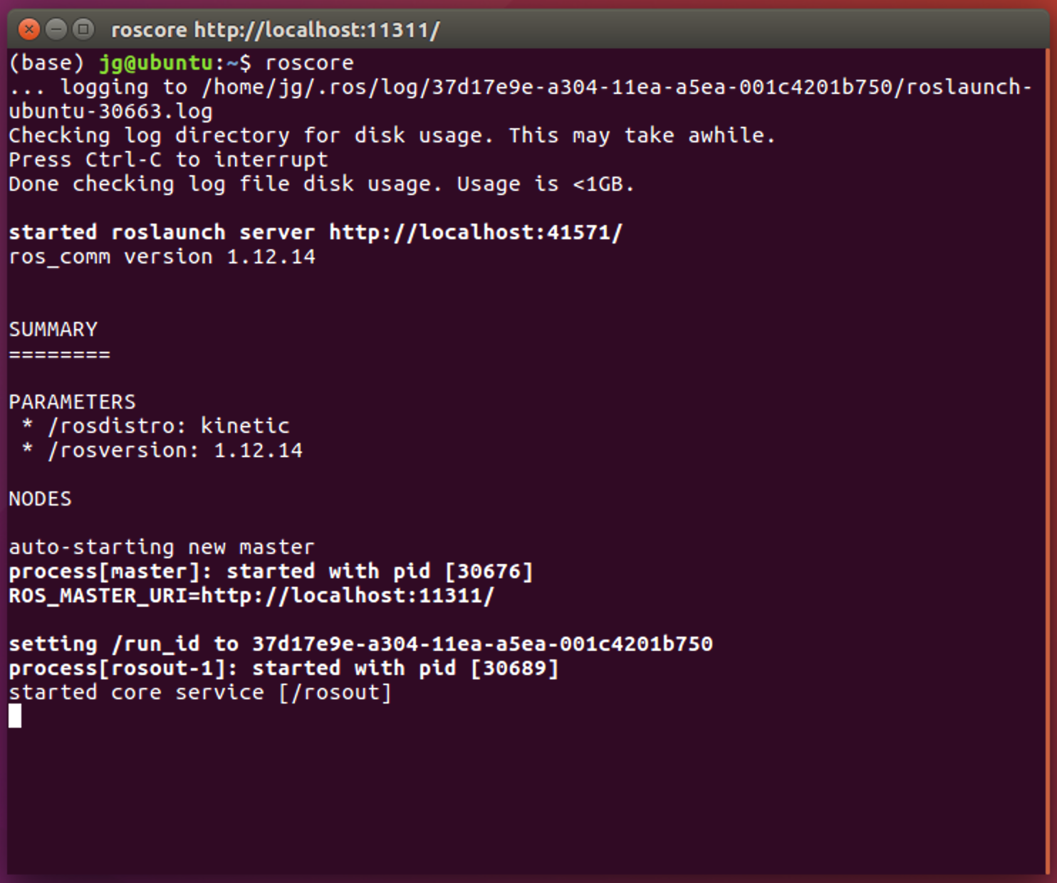 설치시간은 약 5~10분 정도 걸립니다(컴퓨터 사양에 따라 달라질 수 있음). 설치가 완료되면 다음 명령어를 터미널에 입력하여 ROS가 잘 설치 되었는지 확인합니다.