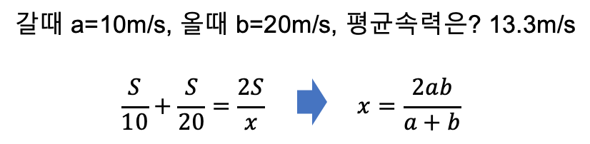F-measure는 Precision(정밀도)와 Recall(재현율)의 조화 평균을 의미합니다. 조화 평균은 아래와 같이 속도에 대한 평균을 계산할 때 사용되는 방법입니다.