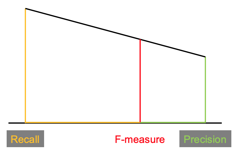F-measure의 값은 Precision과 Recall 사이의 값인데, 두 값 중에서 좀더 작은 쪽으로 치우쳐진 평균값이라고 볼 수 있습니다. 따라서 F-measure는 평균보다는 좀 더 보수적으로 측정값을 도출한다고 볼 수 있습니다.